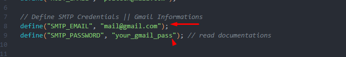 Now Add your gmail email address and password (App Password Which Generated Before) to SMTP_EMAIL & SMTP_PASSWORD see screenshot below.